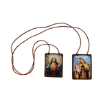 Escapulário padrão de tecido com imagem do Sagrado Coração de Jesus e Nossa Senhora do Carmo.