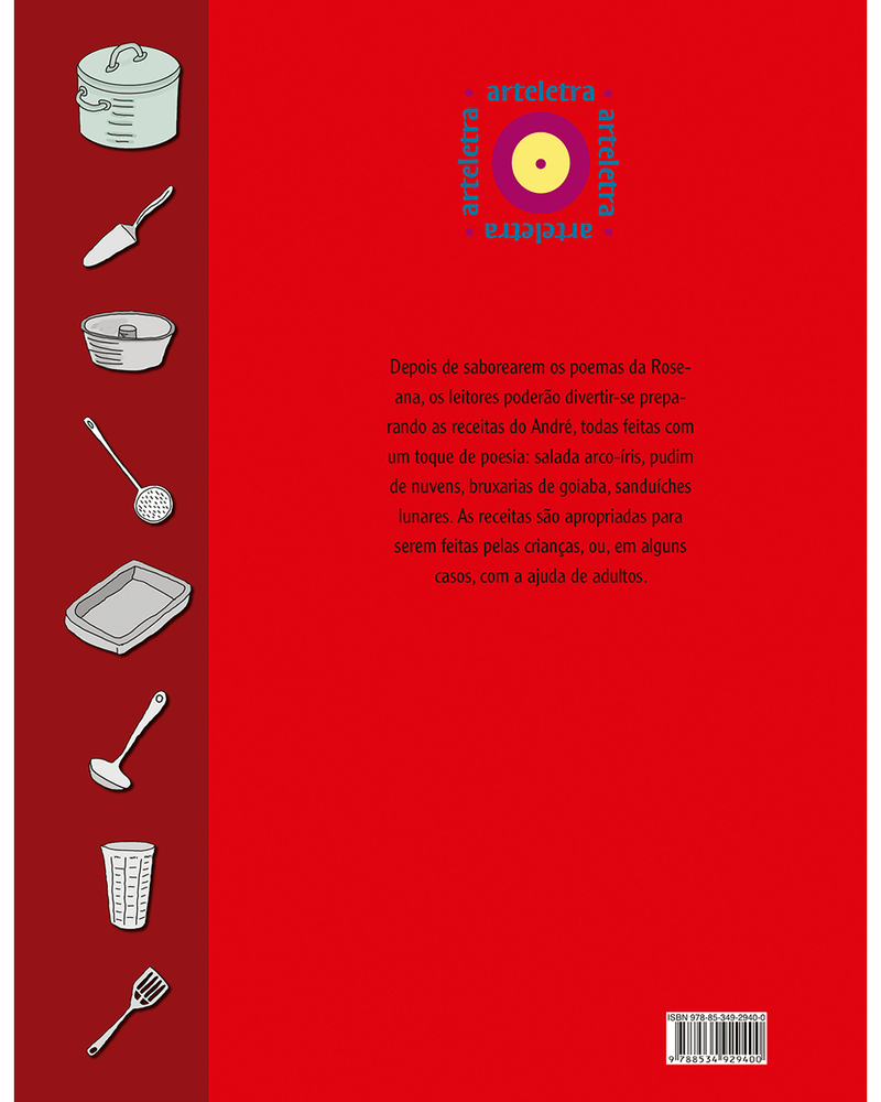 Depois de saborearem os poemas da Roseana, os leitores poderão divertir-se preparando as receitas do André, todas feitas com um toque de poesia: salada arco-íris, pudim de nuvens, bruxarias de goiaba. sanduíches lunares. As receitas são apropriadas para serem feitas pelas crianças, ou, em alguns casos, com a ajuda de adultos.