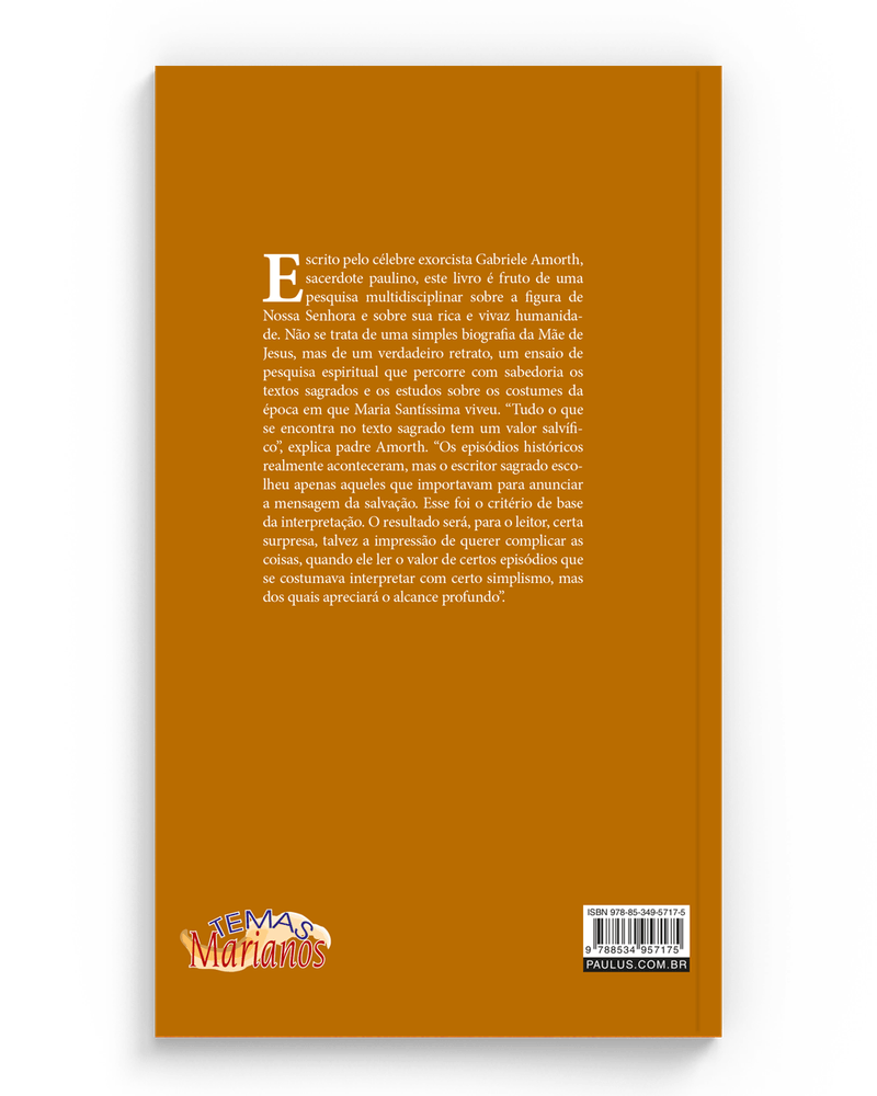 Escrito pelo célebre exorcista Gabriele Amorth, sacerdote paulino, este livro é fruto de uma pesquisa multidisciplinar sobre a figura de Nossa Senhora e sobre sua rica e vivaz humanidade. Não se trata de uma simples biografia da Mãe de Jesus, mas de um verdadeiro retrato, um ensaio de pesquisa espiritual que percorre com sabedoria os textos sagrados e os estudos sobre os costumes da época em que Maria Santíssima viveu. “Tudo o que se encontra no texto sagrado tem um valor salvífico”, explica padre Amorth. “Os episódios históricos realmente aconteceram, mas o escritor sagrado escolheu apenas aqueles que importavam para anunciar a mensagem da salvação. Esse foi o critério de base da interpretação. O resultado será, para o leitor, de certa surpresa, talvez a impressão de querer complicar as coisas, quando ele ler o valor de certos episódios que se costumava interpretar com certo simplismo, mas dos quais apreciará o alcance profundo”.