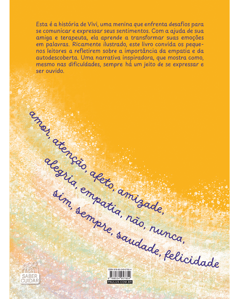 Acompanhe, neste livro, a jornada de Vivi, uma menina que enfrenta desafios únicos na comunicação e na expressão de suas emoções.Desde pequena, Vivi luta para colocar seus desejos e sentimentos em palavras. Com a ajuda de Graziela, sua amiga e terapeuta, ela aprende a transformar suas emoções em linguagem, descobrindo o poder que as palavras têm de conectar e curar.Com ilustrações encantadoras e uma narrativa sensível, a obra nos convida a refletir sobre a importância da comunicação e da empatia.